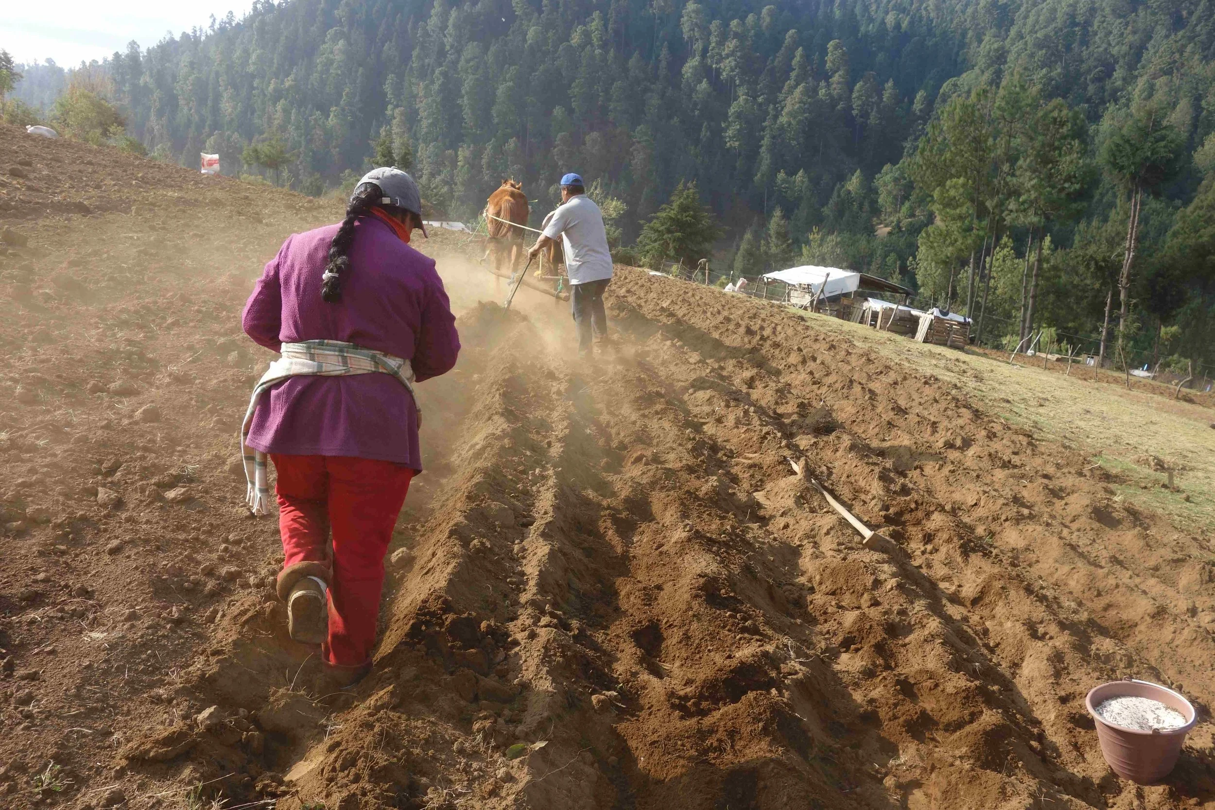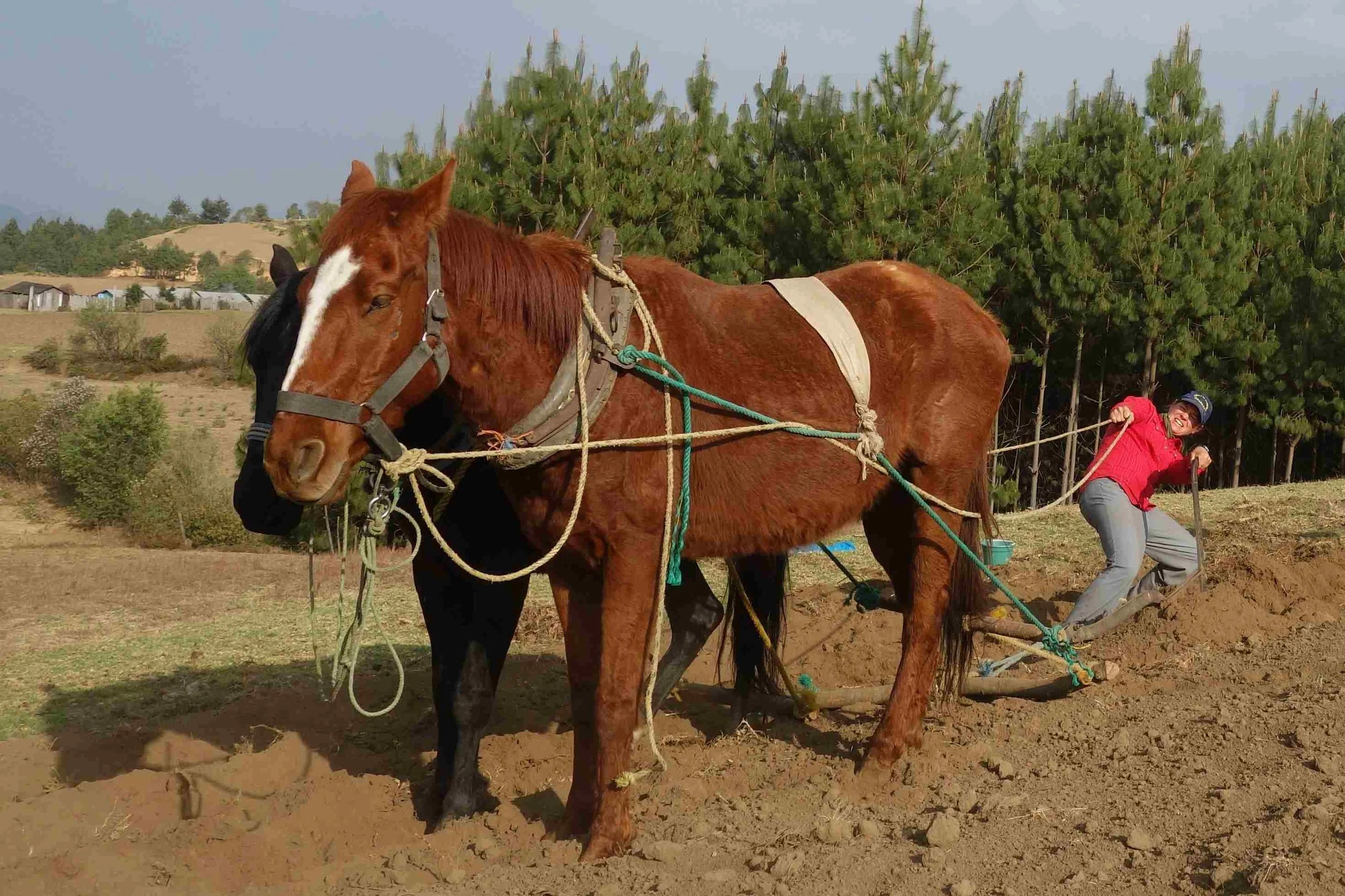 Here is how it works. One person (Brianda’s dad was the expert and her brother was learning) drives the two horses. One horse is theirs and the other they borrow from a friend and will lend their horse when it is time for their friend to plant. After the horses plow a row, Brianda’s mom walks in the line placing three corn kernels in front of her and then stepping on them. She uses both hands and reminds me of a shorebird walking deliberately with a bob down the row. I follow her placing one fava bean in the foot print or one bean between the foot prints. I am much much much less elegant and much more frantic. Her sister follows pushing a bit of dirt with a trowel over the footprint covering the seeds. Her brother comes next putting a small handful of fertilizer on each group of covered seeds, and lastly all is covered up with a bit more dirt. The horses on their next lap stamp the seeds which to my city roots seems unhelpful, though they explain that it is.