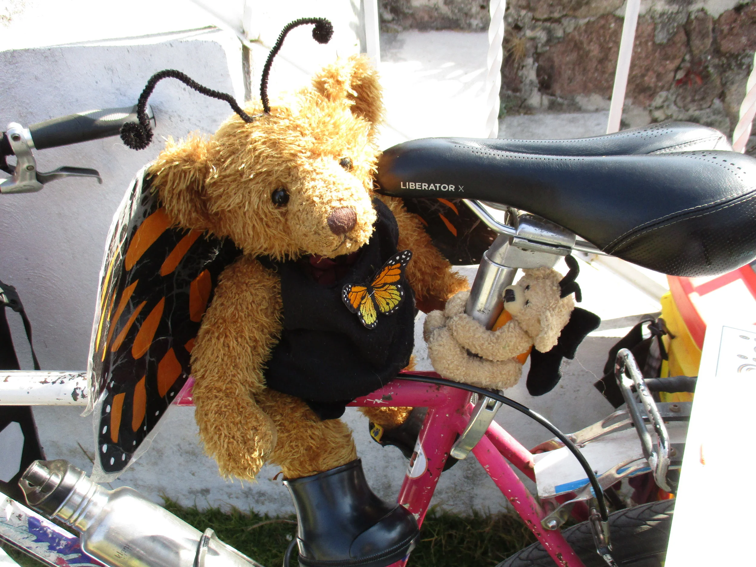 When I push off, waving goodbye to a handful of monarchs that had descended into town, and my new Canadian friends, I know it is time to start moving north. After all the sooner I start, the sooner I’ll be seeing Barb and Darlene again. I’ll be visiting both of them and their monarch stomping grounds when I arrive in Canada, nearly at the most northerly point of my trip. AND the sooner I start, the sooner I’ll get to reacquaint my traveling bear with her big brother and feast on homemade pizza and ice cream! Even pancakes and dessert shaped monarchs were discussed, but that seems too good to be true! I descend the steep mountain road away from the monarchs, but don’t exactly make it too far.